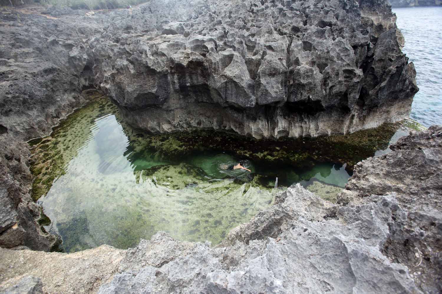 Angel's billabong nusa penida berciri khas sangat artistik dengan batuan karang berwarna hijau kekuningan.