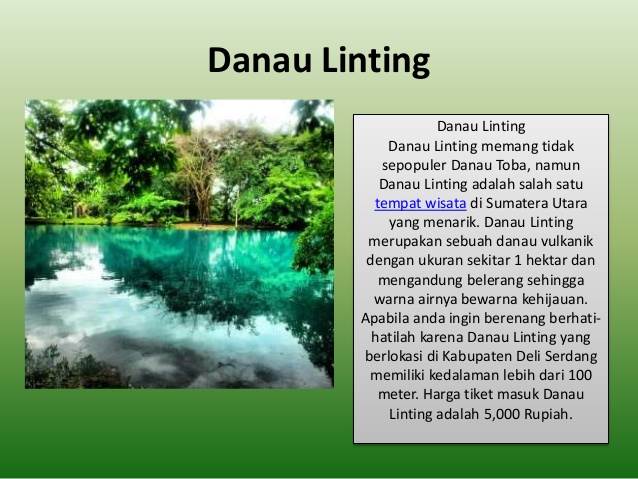 Lokasi Danau Linting Lokasi danau yang dikelilingi oleh pepohonan yang relatif besar, menjadikan tempat ini semakin indah. Airnya hangat dan berwarna hijau kebiruan. Bisa di bilang kawasan ini merupakan tempat paling asri yang dimiliki oleh medan. Danau linting adalah salah satu danau vulkanik di kota medan. Untuk menuju danau linting, kamu juga bisa menggunakan angkutan. Tidak jauh dari lokasi danau linting, terdapat dua gua alam yang masih alami.